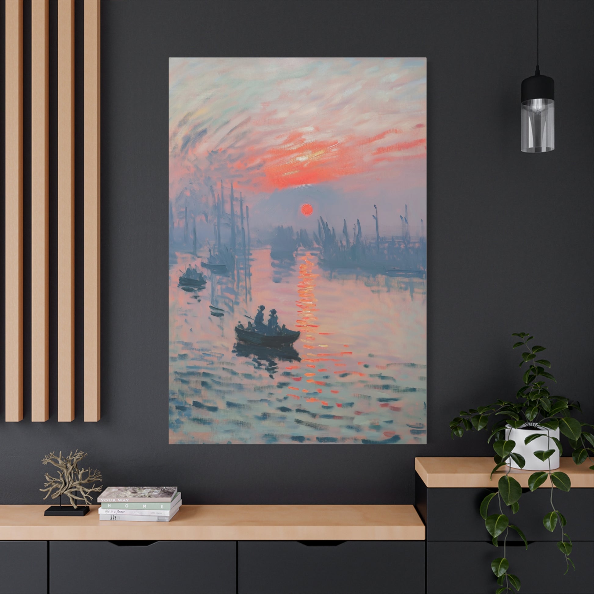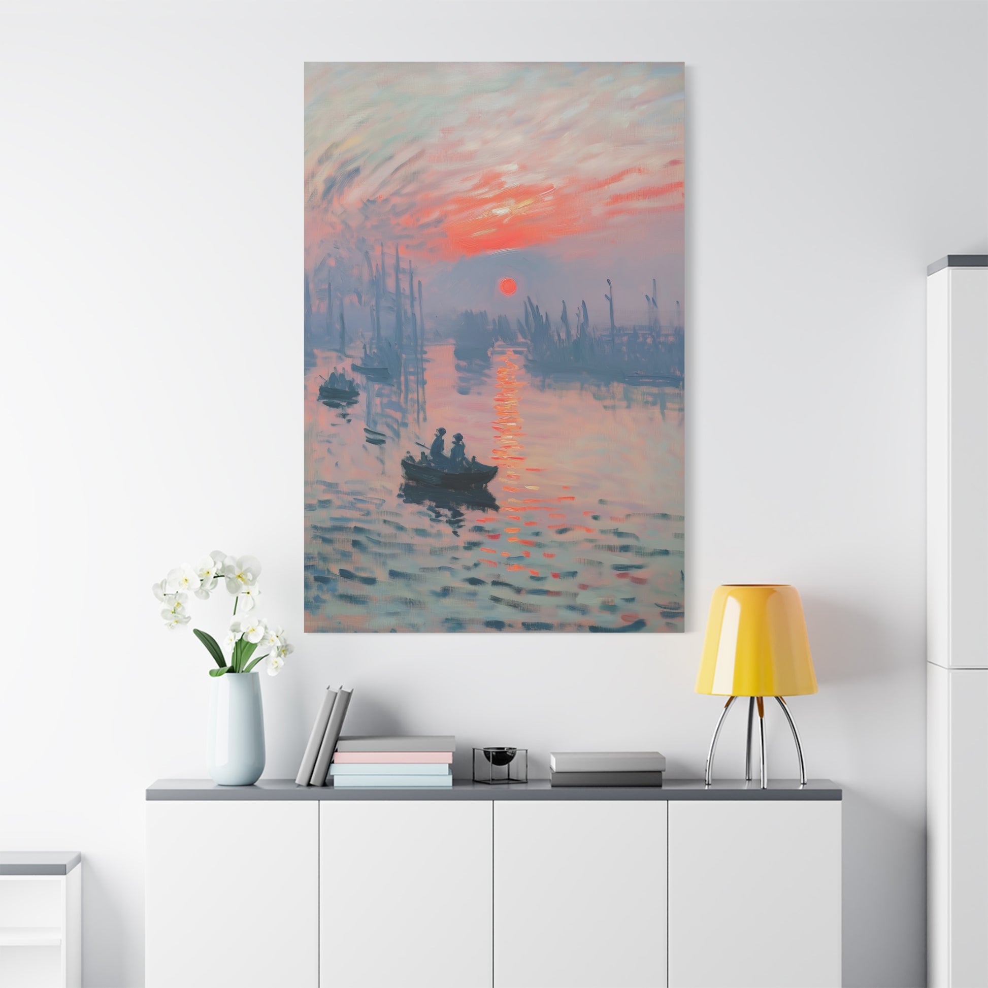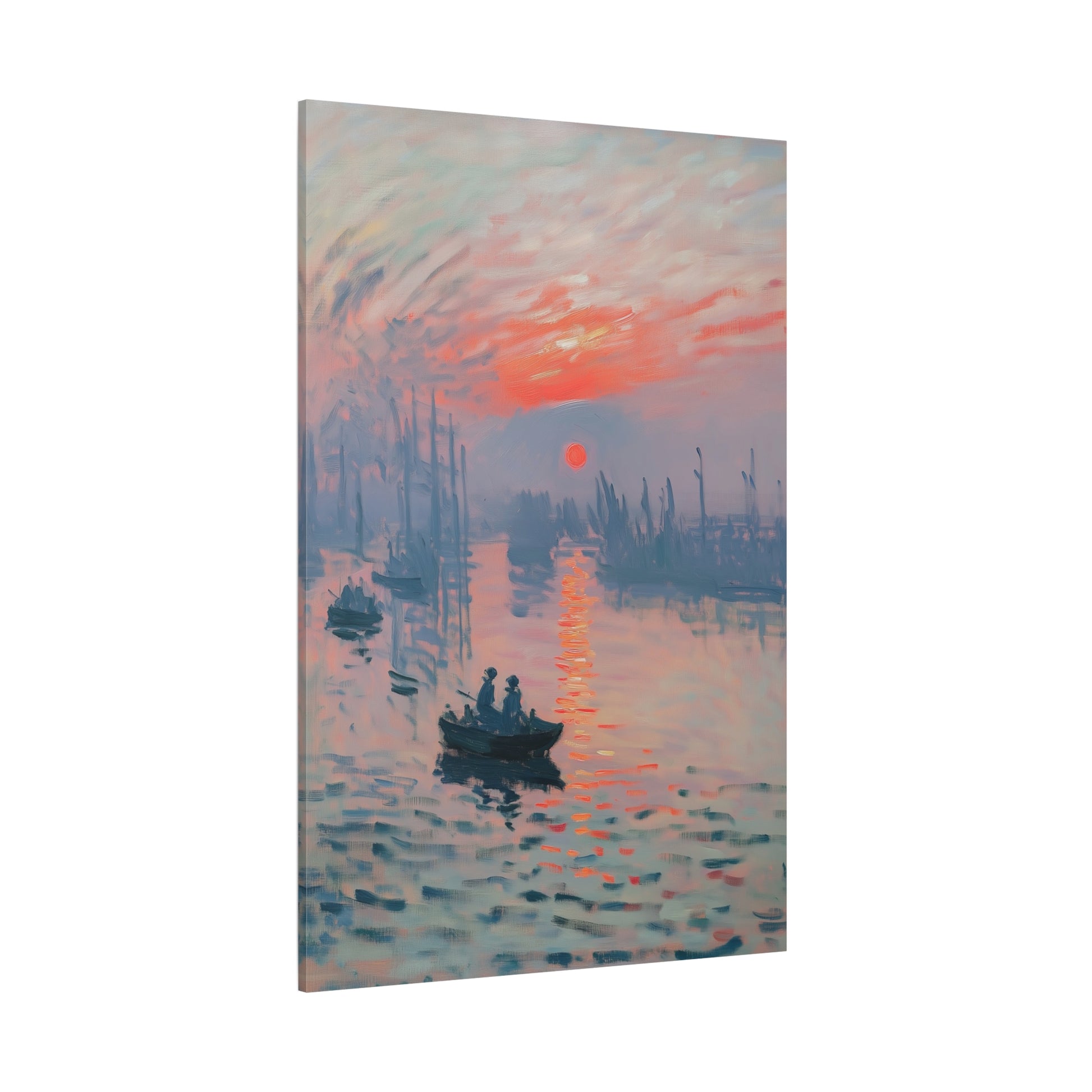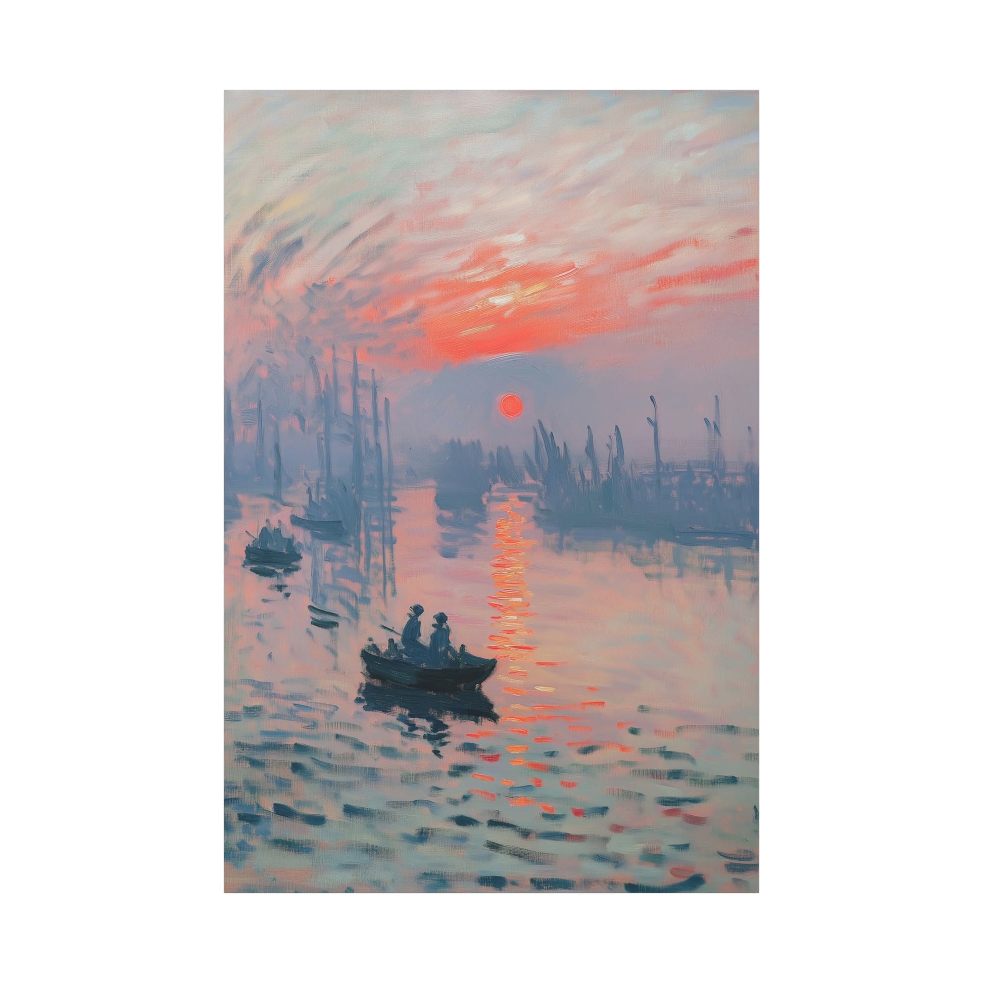 The blend of warm oranges, cool blues, and hazy silhouettes creates a dreamlike scene, transporting the viewer to a peaceful morning on the water. Perfect for art enthusiasts, Impressionist lovers, and elegant home decor, this high-quality canvas print brings a timeless touch of artistic beauty to any space.