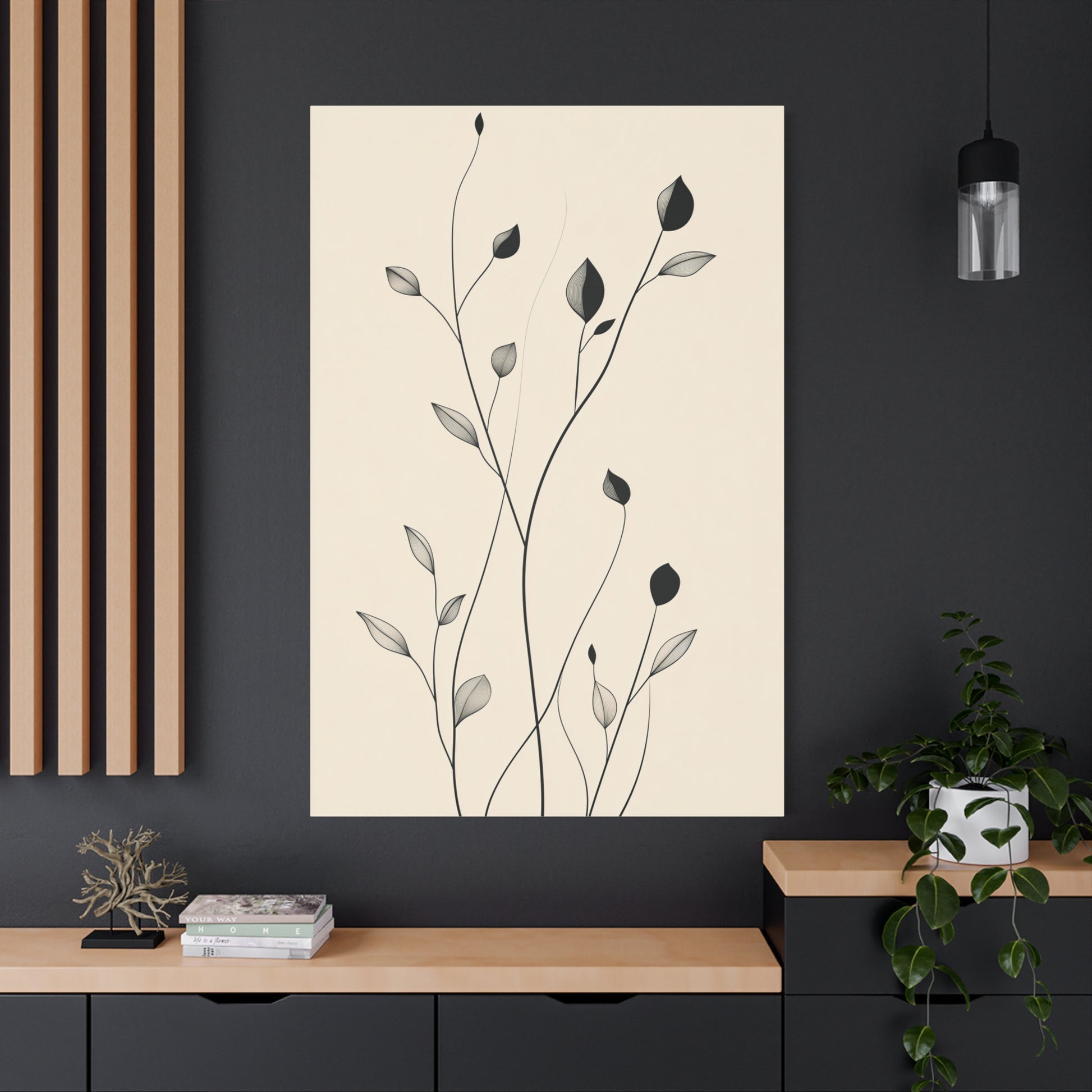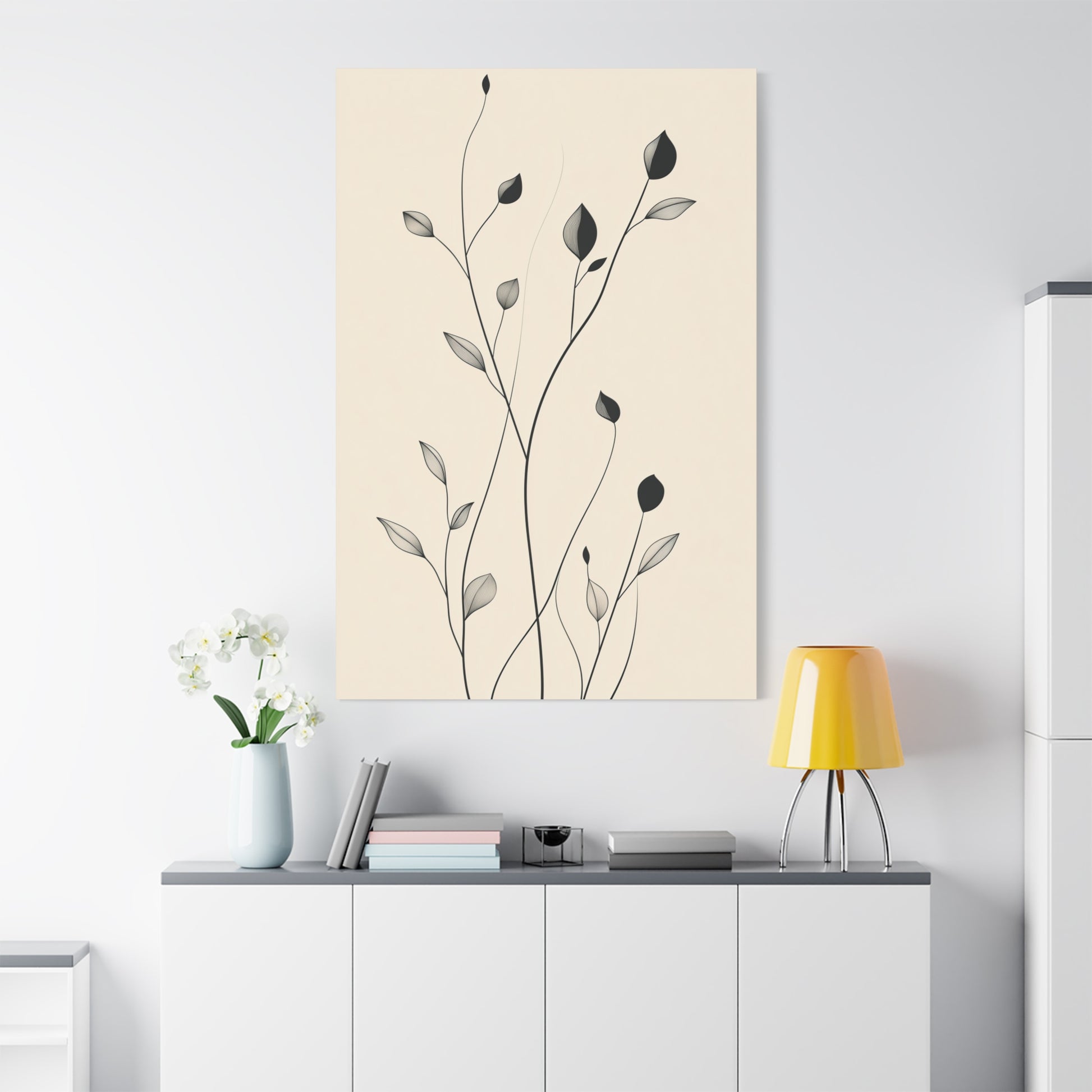 Bring a touch of organic elegance to your space with this minimalist botanical line art canvas, featuring delicate black ink-style branches and leaves against a soft beige backdrop. The refined composition embodies Scandinavian, Japandi, and modern aesthetics, creating a timeless and serene ambiance.