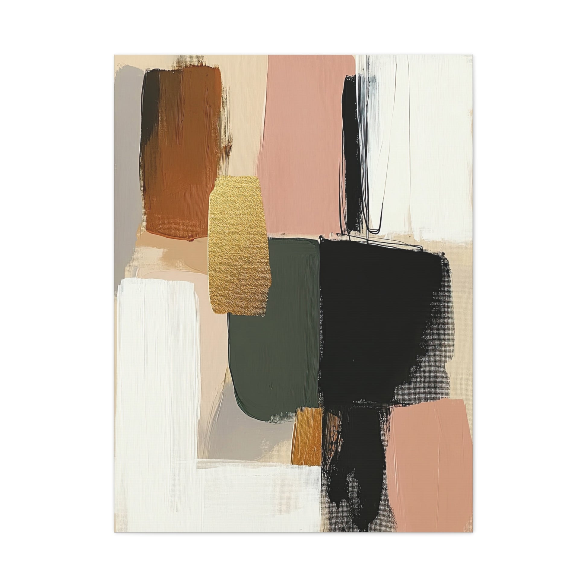 Enhance your space with this stunning modern abstract canvas print, featuring a sophisticated blend of earthy tones such as beige, taupe, olive green, and muted pink. Bold accents of deep black and luxurious gold create a striking contrast, adding depth and intrigue to the composition.