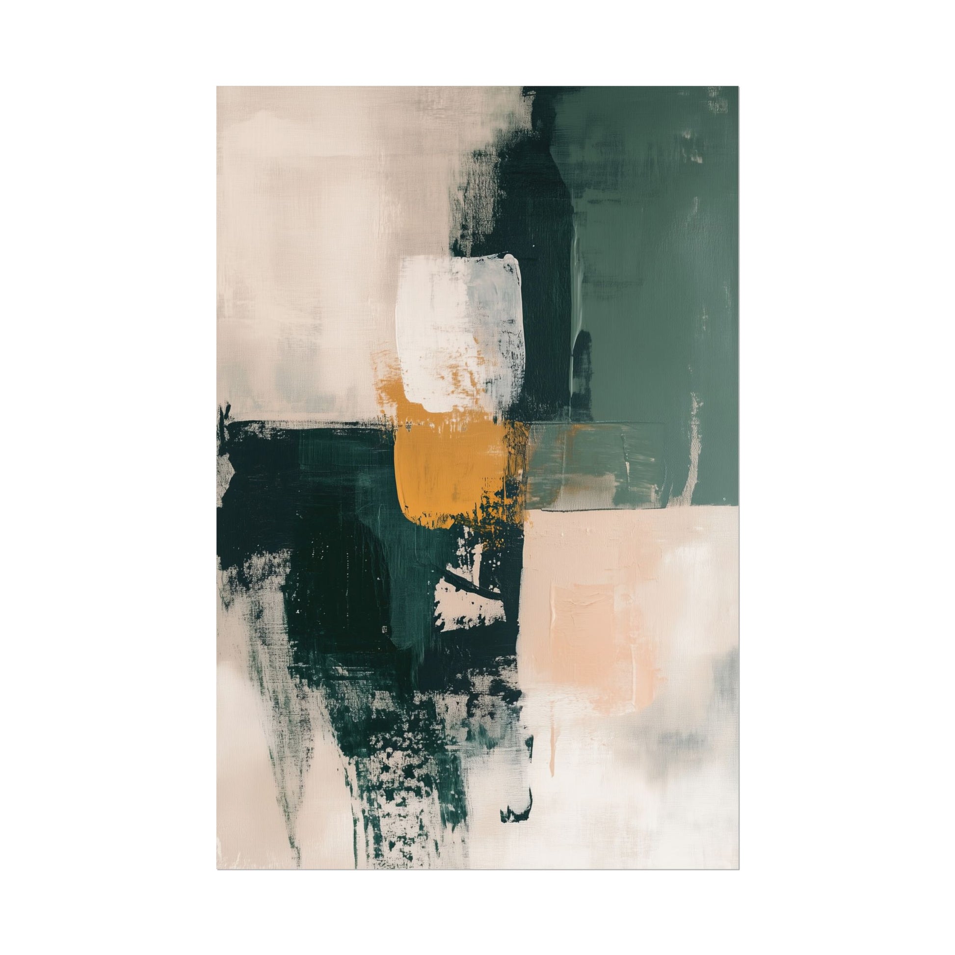 Enhance your space with this modern abstract wall art poster, featuring a harmonious blend of deep greens, warm mustard, soft beige, and crisp white tones. The expressive brushstrokes and layered textures create a sense of movement and depth, making this piece a perfect addition to contemporary, minimalist, and Japandi-inspired interiors.