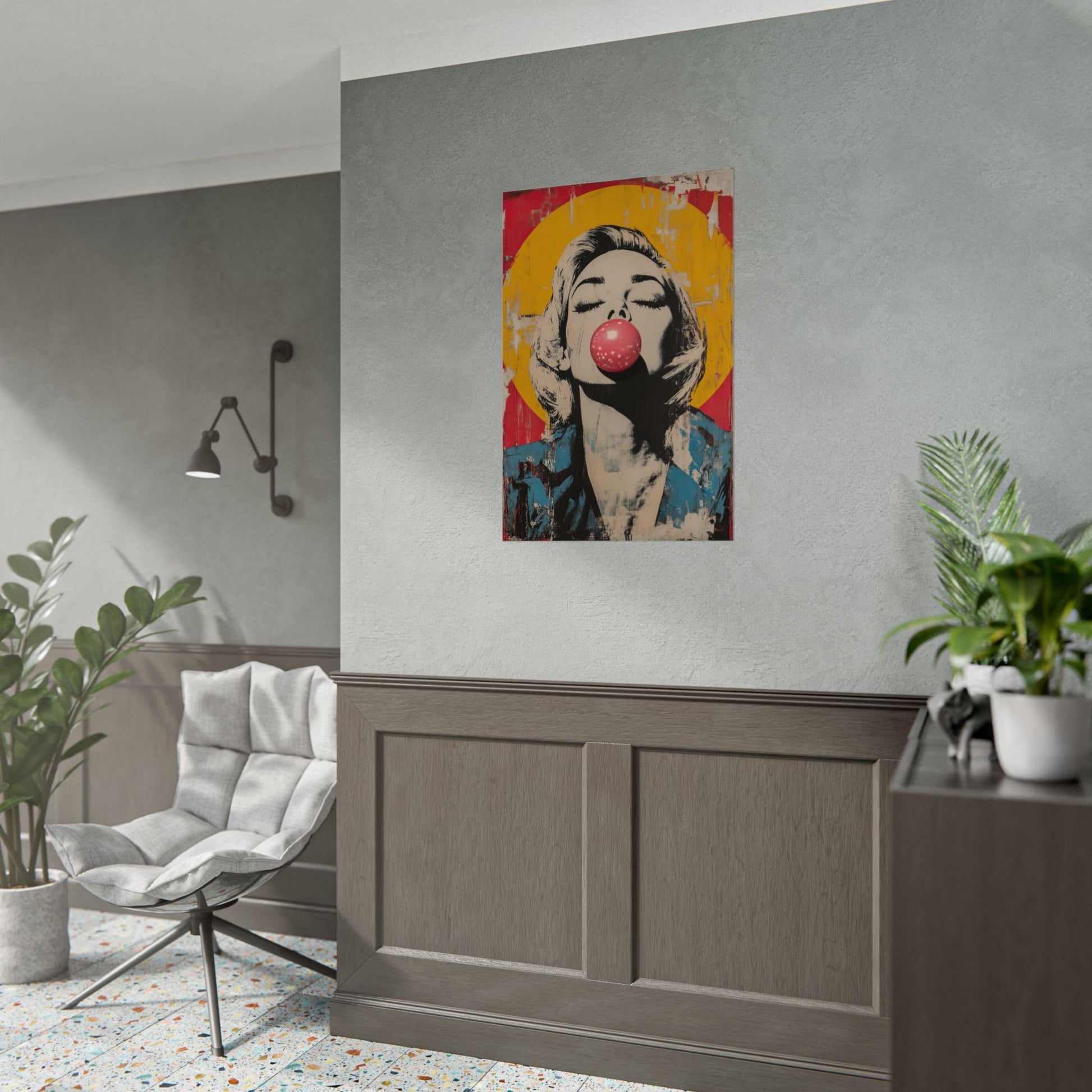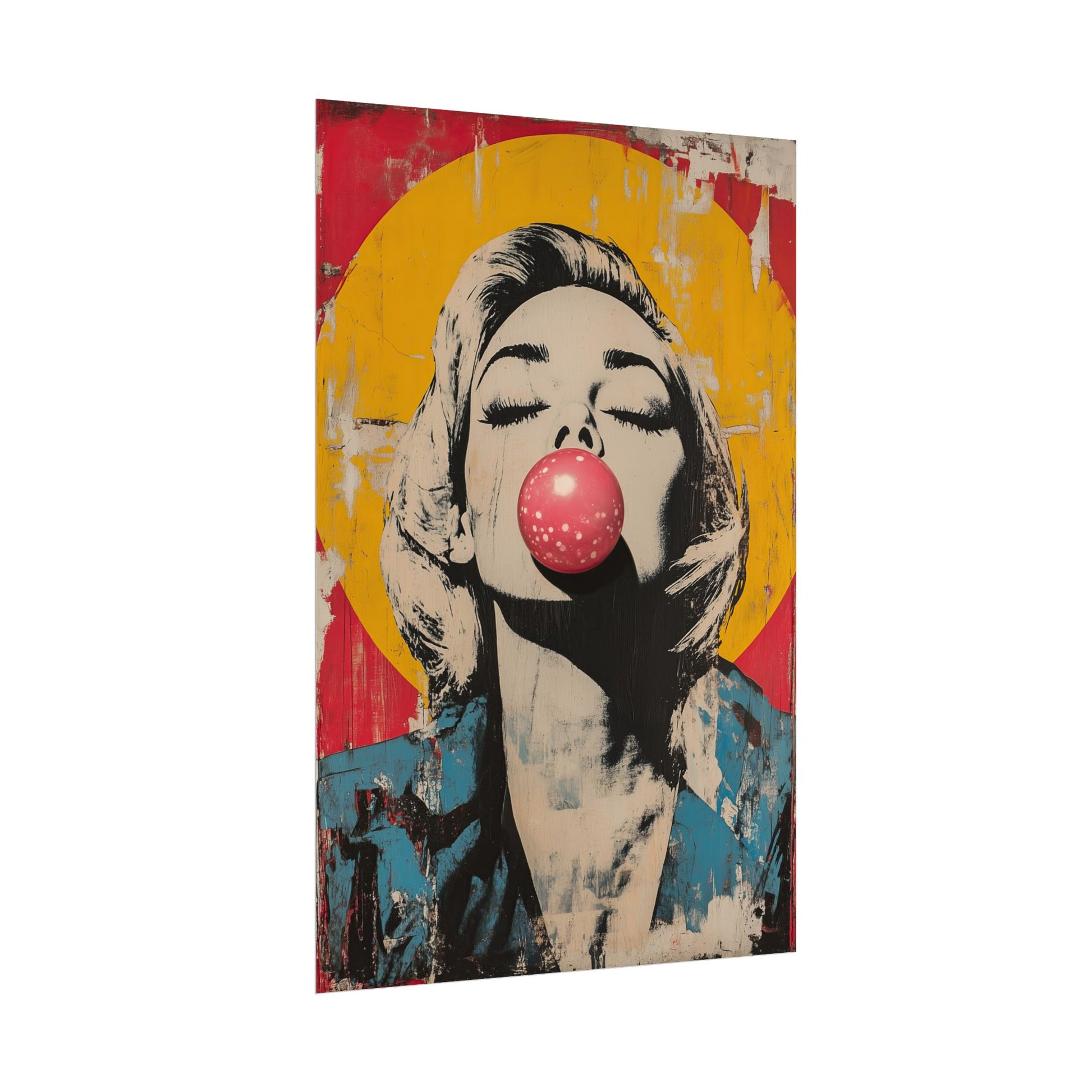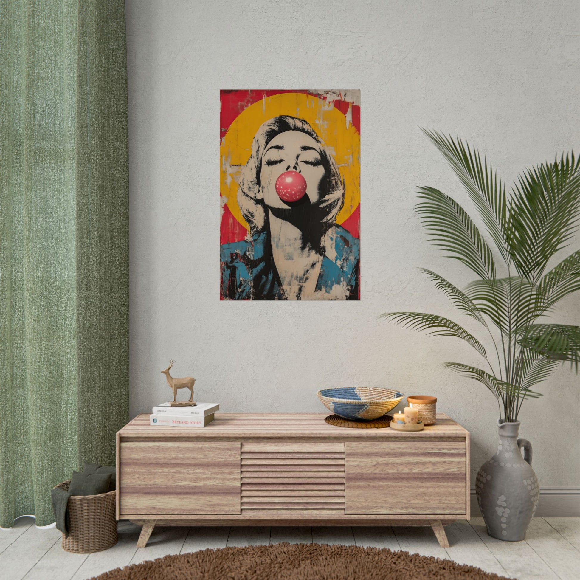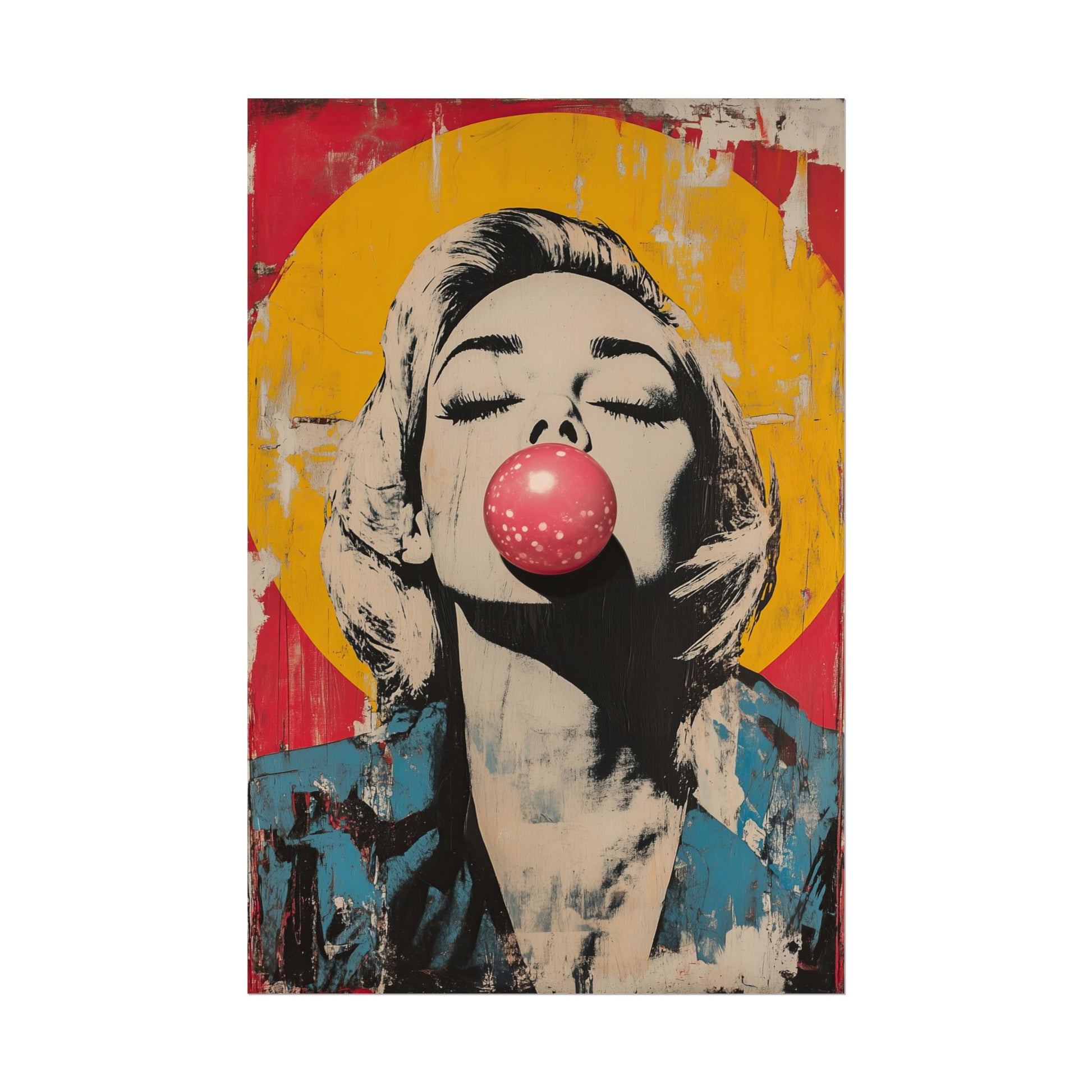 Add a bold and stylish edge to your decor with this striking Pop Art wall print, featuring a retro-inspired portrait of a glamorous woman blowing a bubble gum bubble. The combination of urban street art aesthetics, vintage influences, and bold colors makes this artwork a true statement piece for any modern interior.